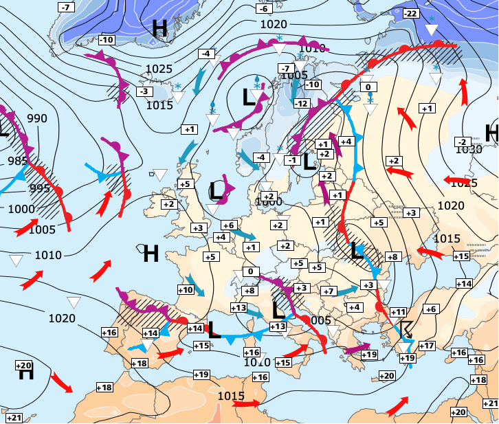 Noms des dépressions et anticyclones prévus pour mardi 26 janvier 2021 à midi (Berlin)