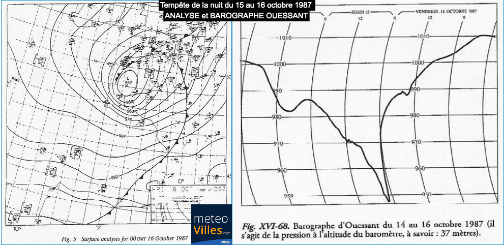 Tempête de la nuit du 15 au 16 octobre 1987 : Carte d’analyse du 16 octobre 1987 à 00hTU et Évolution de la pression atmosphérique à Ouessant dans la nuit du 15 au 16 octobre 1987